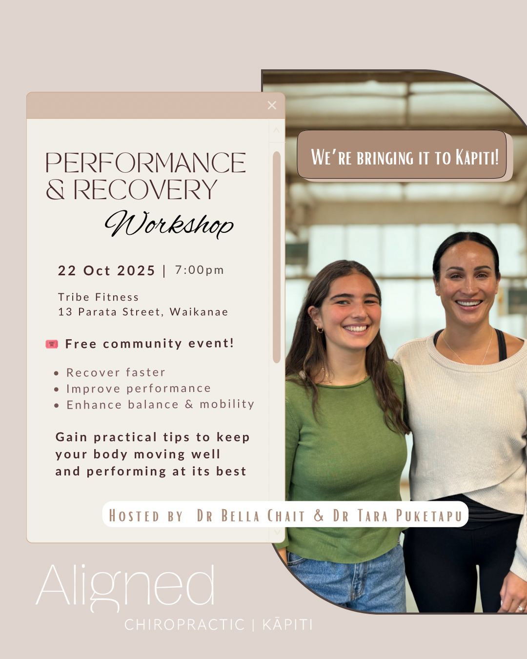 Discover how chiropractic care supports faster recovery and better performance in this free interactive workshop at Aligned Chiropractic | Kāpiti - inside Tribe fitness in Waikanae.